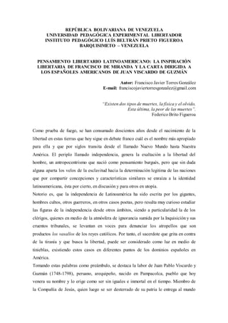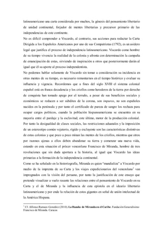 Este documento analiza la influencia del pensamiento libertario del sacerdote peruano Juan Pablo Viscardo y Guzmán y su Carta dirigida a los españoles americanos en el prócer venezolano Francisco de Miranda. Explica que Miranda difundió ampliamente la carta de Viscardo a través de sus publicaciones periódicas y expediciones, lo que ayudó a inspirar la lucha por la independencia latinoamericana. También destaca las similitudes entre el pensamiento de ambos respecto a la necesidad de unión e independencia del continente americano