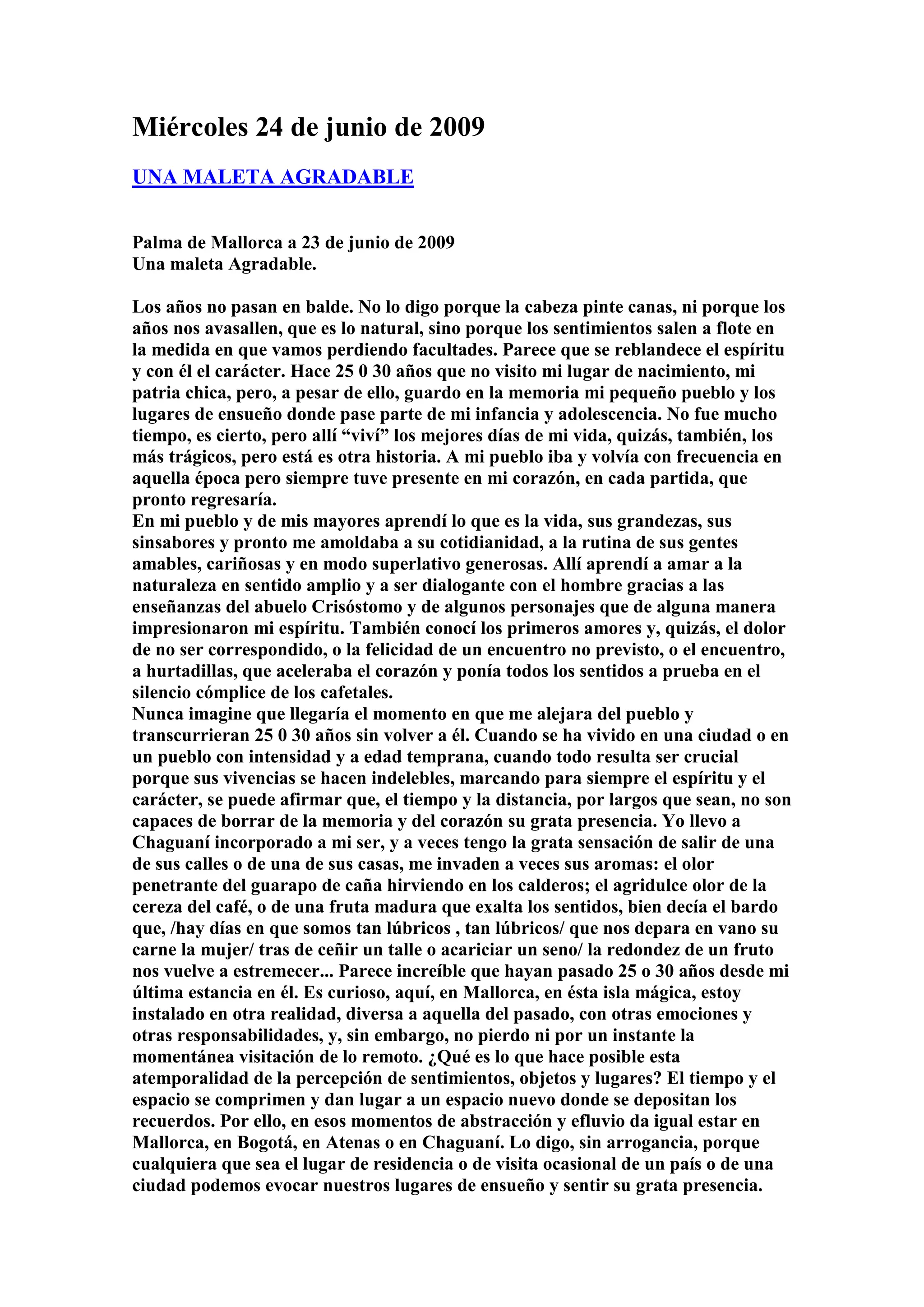 Este documento describe los recuerdos del autor de su pueblo natal, Chaguaní, del que se alejó hace 25-30 años. El autor expresa que a pesar del tiempo transcurrido, aún guarda recuerdos vívidos e indelebles de su infancia y adolescencia en el pueblo, incluyendo personas, paisajes y aromas. Aunque ahora vive en Mallorca, el autor es capaz de evocar con facilidad sus lugares de ensueño en Chaguaní a través de la memoria y la imaginación. Concluye que solo olvidamos