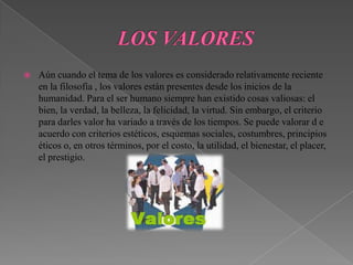 Este documento clasifica y describe diferentes tipos de valores. Identifica valores morales como la justicia y la honestidad. Explica que los valores éticos son medios para alcanzar objetivos, mientras que los valores infrahumanos y humanos inframorales incluyen placer, fuerza, riqueza e inteligencia. También distingue entre valores instrumentales, que son comportamientos para lograr fines, y valores terminales, que son objetivos a largo plazo.
