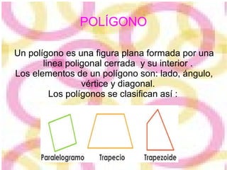 Este documento define y explica conceptos geométricos básicos como polígonos, triángulos, paralelogramos, cuadriláteros, círculos, radios, diámetros y más. Explica que un polígono es una figura plana formada por una línea poligonal cerrada y su interior, y que los triángulos y cuadriláteros suman 180° y 360° respectivamente. También define conceptos circulares como radio, diámetro, centro, arco y circunferencia.