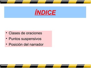 Este documento describe diferentes tipos de oraciones, incluyendo oraciones enunciativas, interrogativas, exclamativas y más. También explica las oraciones activas y pasivas, simples y compuestas. Además, cubre el uso de puntos suspensivos y la importancia de decidir la posición del narrador (primera o tercera persona) antes de contar una historia.