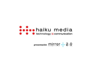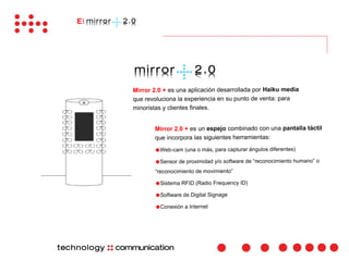 Mirror 2.0+ es una aplicación desarrollada por Haiku media que combina un espejo con una pantalla táctil para minoristas. La aplicación utiliza cámaras, sensores, RFID y software de señalización digital para reconocer clientes, mostrar productos de forma interactiva y medir datos sobre los clientes. Esto mejora la experiencia de compra para los clientes y ofrece oportunidades a los minoristas.