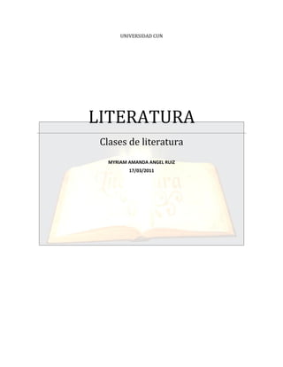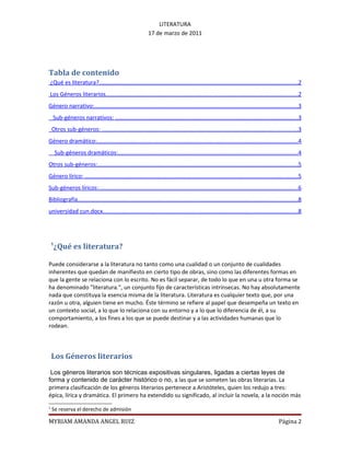 Este documento proporciona una introducción a los géneros literarios. Define la literatura y explica las tres categorías principales de géneros literarios establecidas por Aristóteles: narrativa, dramática y lírica. Luego describe varios subgéneros dentro de cada categoría principal, incluidos el cuento, la novela, la tragedia, la comedia y la poesía lírica. El documento ofrece definiciones concisas de cada género y subgénero discutido.