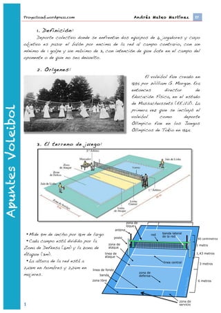 Este documento resume las reglas y conceptos básicos del voleibol. Explica que el voleibol fue creado en 1895 por William G. Morgan y se incluyó por primera vez en los Juegos Olímpicos de 1964. Describe el terreno de juego, la duración de los partidos, las reglas básicas como el número de jugadores y toques permitidos, y las sanciones. También cubre los sistemas de puntuación, las posiciones de los jugadores y los sistemas tácticos de recepción y ataque. Por último, introduce