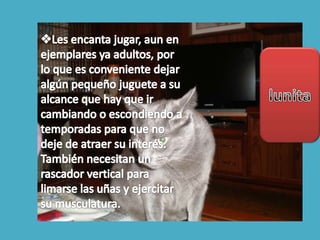 El documento contiene varias descripciones de diferentes mascotas, incluyendo perros como el azul ruso, el dogo argentino, el carlina, el bull terrier y el spaniel; también menciona a un gato y un loro gris. Proporciona detalles sobre el tamaño, el pelaje, el temperamento y el origen de estas especies.