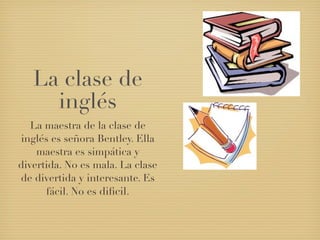Katia describe sus clases de inglés, horticultura, español y arte. Ella dice que las maestras de inglés y horticultura son simpáticas y que esas clases son fáciles y divertidas. La maestra de español también es simpática pero la clase es más difícil aunque interesante. El maestro de arte es cómico y esa clase es fácil y divertida.
