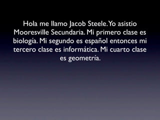Jacob Steele asiste a la secundaria Mooresville. Sus cuatro clases principales son biología, español, informática y geometría. Describe a sus compañeros y profesores, así como los materiales necesarios para cada clase.