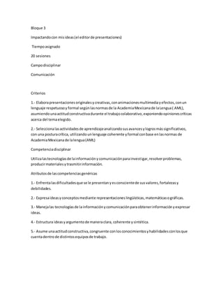 Este documento describe un bloque de 20 sesiones sobre comunicación que enseña a estudiantes a crear presentaciones originales y creativas usando un editor de presentaciones. Los estudiantes aprenderán a expresar ideas de manera clara, coherente y sintética mientras trabajan de forma colaborativa y constructiva. El objetivo es enseñar a los estudiantes a mejorar su aprendizaje a través del uso de tecnologías de información.