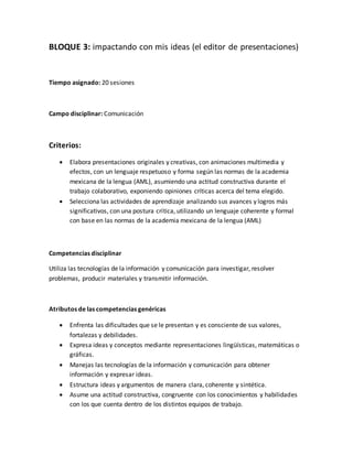 Este documento presenta el bloque 3 de un curso de Informática I sobre el uso del editor de presentaciones. El bloque se enfoca en enseñar a los estudiantes a crear presentaciones originales, creativas y con efectos multimedia, respetando las normas del lenguaje. Los estudiantes aprenderán a analizar y seleccionar actividades de aprendizaje para mejorar sus habilidades con un enfoque crítico y formal. El objetivo es que utilicen las tecnologías para investigar, resolver problemas y transmitir información de manera efectiva.