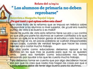 Este documento resume una discusión en clase sobre una reforma educativa en México que prohíbe reprobar a los estudiantes. Algunos argumentan que esto podría hacer que los estudiantes sean menos responsables, mientras que otros dicen que los maestros deben apoyar más a los estudiantes. También se discute una fiesta de bienvenida estudiantil que no fue bien organizada y causó problemas entre los estudiantes.