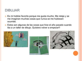 El documento describe los varios hobbies de Martina Rodriguez Urquiola, una estudiante de 1°C. Entre sus hobbies favoritos se encuentran dibujar, jugar al hockey, andar en bicicleta, bailar, cocinar, jugar con su perro Rocco, leer, ir al parque, hacer sudokus y sopas de letras, y escuchar música. Ella disfruta estas actividades porque le permiten relajarse, usar su imaginación, aprender nuevas habilidades, pasar tiempo con su familia, y divertirse.