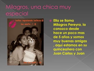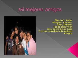 La autora tiene un grupo de mejores amigas que viven cerca de su casa, incluyendo a Katia, Milagros, Aracely, Ana y Shakira. Describe a tres de sus amigas más detalladamente: Milagros, a quien conoce hace más de 5 años y está celebrando su quinceañero; Katherine, con quien estudia en la escuela y en la que puede confiar; y Marber, a quien considera su fiel compañera en aventuras.