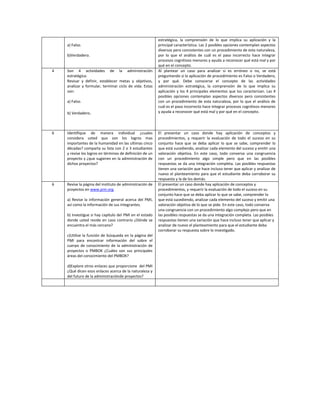 Este documento presenta varias preguntas de nivel cognitivo creciente sobre conceptos clave de administración de proyectos. Las preguntas van desde definir términos básicos como ciclo de vida de proyectos y características de proyectos, hasta identificar dimensiones técnicas y socioculturales y elementos de la administración integrada de proyectos. Las preguntas también cubren el análisis de casos y la revisión de recursos en línea sobre el Instituto de Administración de Proyectos.