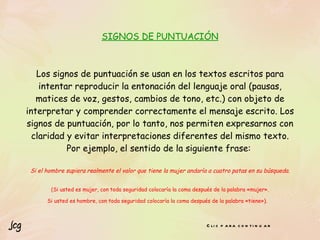 El documento explica los diferentes signos de puntuación del español y cómo estos ayudan a interpretar correctamente un texto al reproducir la entonación del lenguaje oral. Luego presenta un ejemplo de un testamento sin puntuación que lleva a diferentes interpretaciones según cómo se puntué, mostrando la importancia de los signos de puntuación al escribir.