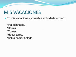 Durante sus 3 semanas de vacaciones, el autor realizó varias actividades como ir al gimnasio, dormir, comer, hacer tareas y salir a comer helado. También trabajó brevemente en una papelería con una tía y se encargó de las labores del hogar mientras su madre y hermana estaban fuera. Algunas otras actividades incluyeron barrer su casa y jugar fútbol.