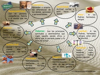 El documento lista valores como la honradez, amor, solidaridad, justicia, lealtad, igualdad, tolerancia, amabilidad, responsabilidad y respeto. Explica que los valores son los principios y actitudes que guían la escala ética y moral de una persona. Además, señala que los valores son fundamentales para el crecimiento personal y para diferenciar a los humanos de otras especies.