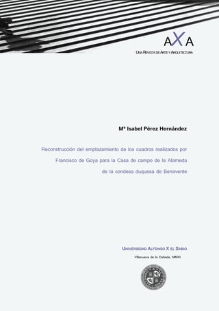 Este documento presenta una investigación sobre la reconstrucción del emplazamiento de los cuadros pintados por Francisco de Goya para la Casa de campo de la Alameda de la condesa duquesa de Benavente en diferentes momentos. Incluye antecedentes sobre los encargos de Goya por los duques de Osuna, una cronología de eventos y obras realizadas en el palacio de la Alameda, y planes propuestos para situar los 7 cuadros de género pintados por Goya para la Alameda en 1787. El objetivo es reconstruir de