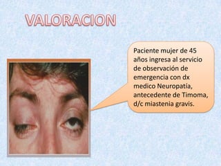 Paciente mujer de 45 años ingresa al hospital con diagnóstico de miastenia gravis y dificultad respiratoria. Recibe tratamiento con piridostigmina, corticoides y oxígeno, pero su condición empeora y requiere intubación y ventilación mecánica. La miastenia gravis causa debilidad muscular fluctuante debido a anticuerpos que bloquean los receptores de acetilcolina en la unión neuromuscular.