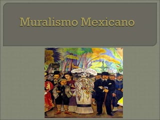 El muralismo fue un movimiento artístico mexicano del siglo XX con un fin educativo de unificar a México después de la revolución a través de murales que proyectaban la situación social y política del país. Los principales muralistas fueron Diego Rivera, David Alfaro Siqueiros y José Clemente Orozco, quienes abordaron temas como la conquista, la revolución, el socialismo y el capitalismo en sus obras plasmadas en edificios públicos.