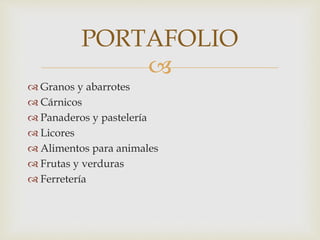 La miscelánea Zamy es una empresa ubicada en Guadalajara De Buga que vende una variedad de productos al por menor, incluyendo granos, carnes, panadería, licores, frutas y verduras. Ofrece productos panaderos de alta calidad, materias primas de la mejor calidad, distribución a tiendas con ganancias del 20% para tenderos, y horarios extendidos de lunes a domingo. Su mercado objetivo incluye varias veredas cercanas, fincas, colegios y empresas.