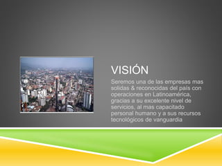 El documento presenta la misión, visión y servicios de soporte técnico de una empresa. Su misión es prestar servicios de asesoría y soporte técnico de forma ágil y responsable. Su visión es convertirse en una de las empresas más sólidas y reconocidas de Latinoamérica gracias a sus servicios de alta calidad. Los servicios de soporte técnico incluyen mantenimiento de hardware y software, instalación de repuestos, limpieza de equipos y reparación de unidades, entre otros.