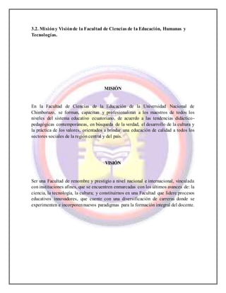 La Universidad Nacional de Chimborazo tiene como misión formar profesionales emprendedores con bases científicas y axiológicas que contribuyan a solucionar los problemas del país. Su visión es ser una institución líder comprometida con el progreso sostenible de acuerdo con el Plan Nacional de Desarrollo. La Facultad de Ciencias de la Educación, Humanas y Tecnologías tiene como misión formar maestros de acuerdo a tendencias didácticas contemporáneas, y su visión es ser una facultad de re