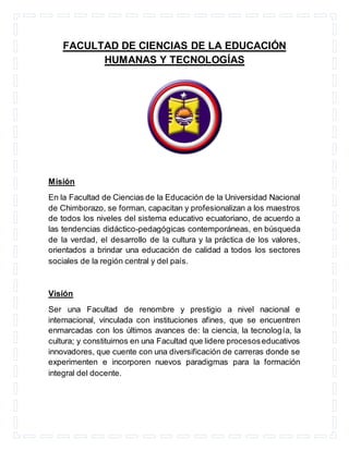 La Universidad Nacional de Chimborazo tiene como misión crear, desarrollar y difundir el conocimiento a través de la formación académica, investigación y vinculación con la comunidad bajo principios de equidad e interculturalidad. Su visión es ser una institución líder en la zona 3 de Ecuador con reconocimiento nacional e internacional. La Facultad de Ciencias de la Educación Humana y Tecnologías forma maestros de todos los niveles educativos según tendencias pedagógicas contemporáneas, y su visión es ser