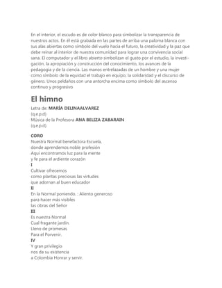 Este documento presenta la misión, visión, escudo y himno de una Escuela Normal Superior de Barranquilla, Colombia. Su misión es formar maestros de preescolar y primaria con competencias pedagógicas, laborales y culturales para transformar críticamente la educación. Su visión es ser líder en la formación de maestros comprometidos con el desarrollo educativo local a través de propuestas investigativas. El escudo representa los colores de la bandera de Barranquilla y símbolos como una paloma, un libro y