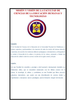 La misión de la Universidad Nacional de Chimborazo es crear, desarrollar y difundir el conocimiento a través de la formación académica, investigación y vinculación con la comunidad bajo principios de equidad e interculturalidad. Su visión es ser una institución líder en educación en la zona 3 de Ecuador con reconocimiento nacional e internacional. La misión de su Facultad de Ciencias de la Educación es formar maestros de acuerdo a tendencias pedagógicas contemporáneas. Su visión es ser una facultad de re
