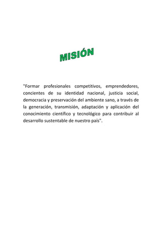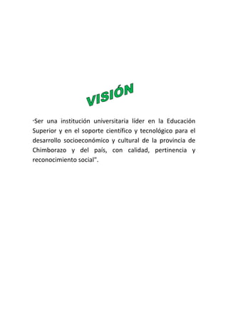 El documento presenta la misión y objetivos de la Escuela Politécnica del Chimborazo (ESPOCH). La misión es ser una institución líder en educación superior y soporte científico-tecnológico para el desarrollo de la provincia de Chimborazo y el país. Los objetivos incluyen formar profesionales competitivos con conciencia social y ambiental, lograr una administración eficiente, y fortalecer la investigación vinculada a sectores productivos.