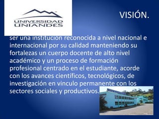 Esta universidad particular tiene como misión formar profesionales de tercer y cuarto nivel con conciencia ética y capacidad de investigación para contribuir al desarrollo nacional mediante una educación humanista, cultural y científica. Su visión es ser reconocida a nivel nacional e internacional por su calidad educativa, manteniendo un cuerpo docente de alto nivel y un proceso de formación centrado en el estudiante y acorde con los avances científicos y tecnológicos.