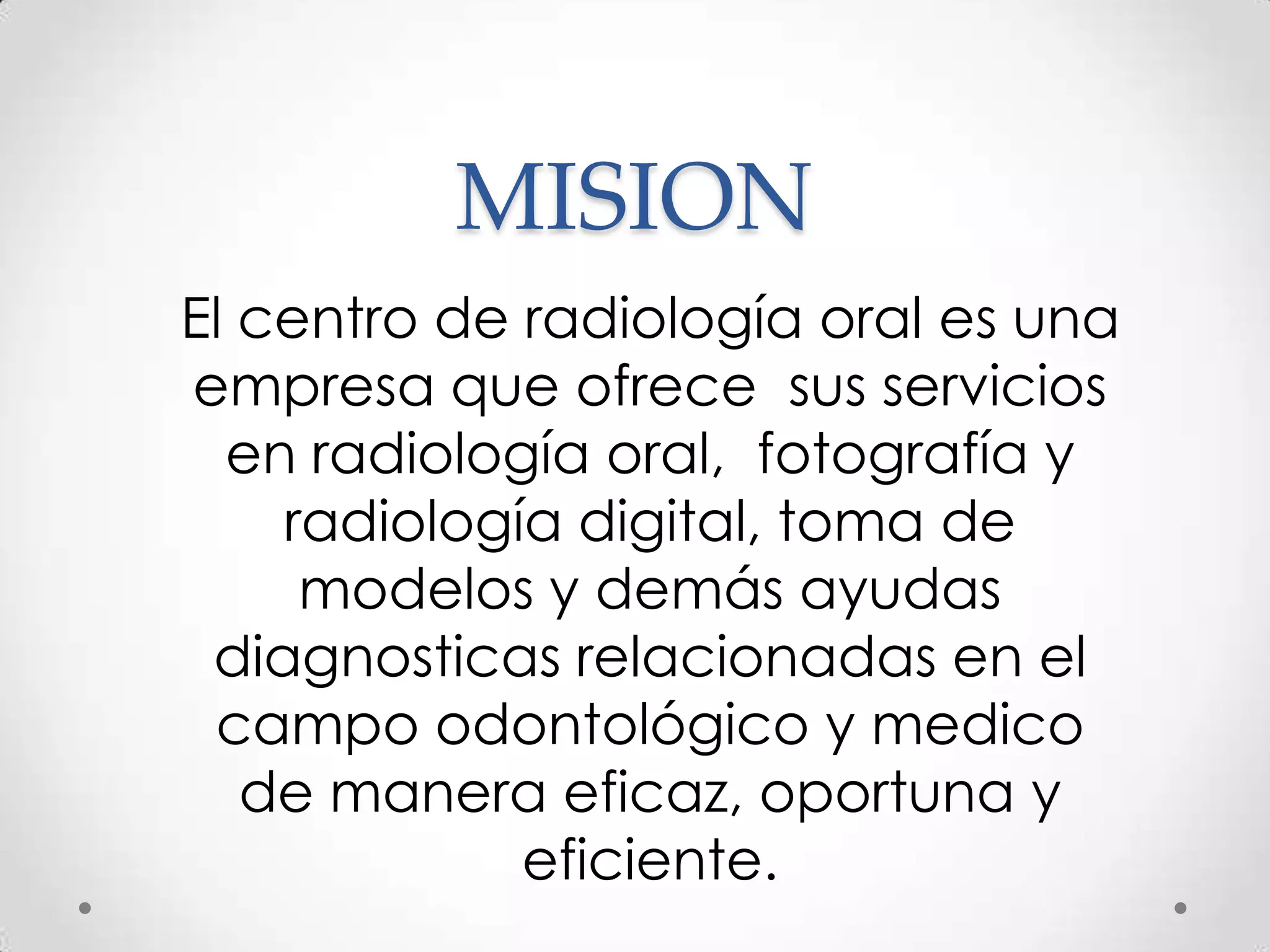 El centro de radiología oral ofrece servicios de radiología oral, fotografía digital y ayudas de diagnóstico en el campo odontológico y médico de manera eficaz. Su visión es ser la principal alternativa en la prestación de servicios de radiología oral, considerando las necesidades de los clientes y brindando soluciones de valor agregado con excelencia. Sus objetivos son satisfacer las necesidades de clientes externos e internos que demanden sus servicios con soluciones de calidad para ganar su confianza.