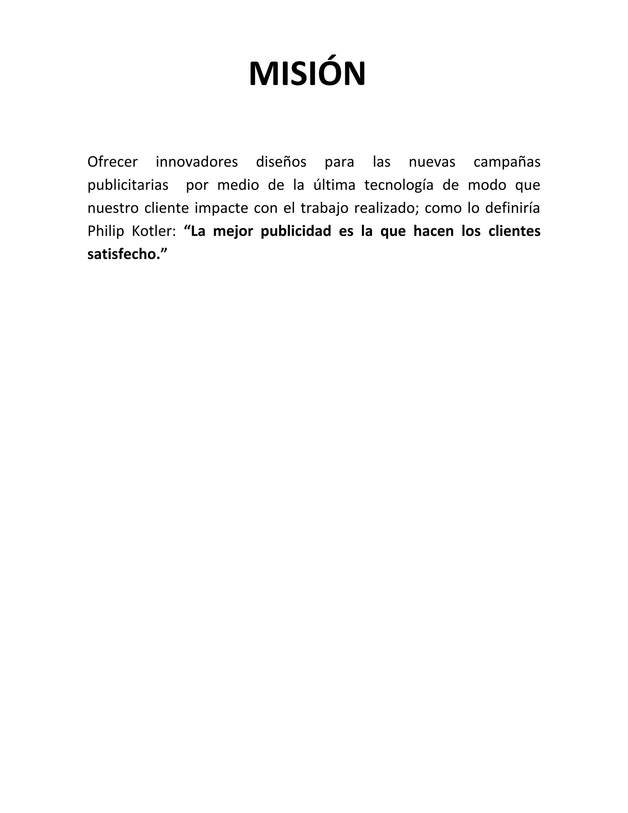 La misión es ofrecer innovadores diseños para campañas publicitarias usando la última tecnología para que los clientes queden satisfechos e impactados, y así generen publicidad positiva por medio de recomendaciones como lo definiría Philip Kotler.