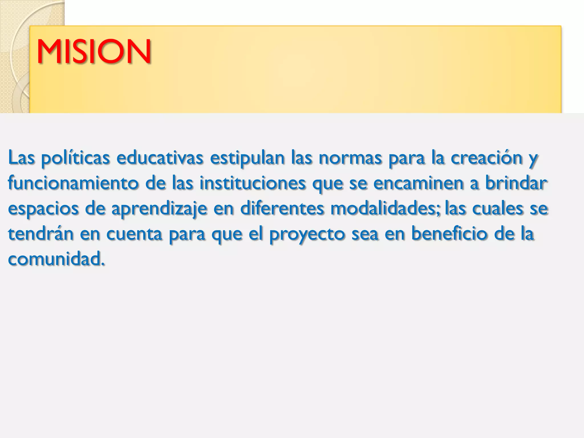 Las políticas educativas establecen normas para las instituciones educativas para brindar aprendizaje a la comunidad. La visión es desarrollar un plan educativo basado en los parámetros legales que inculque valores sociales como la aceptación, tolerancia y respeto a través de la colaboración con la comunidad.
