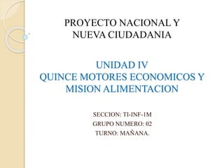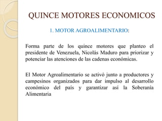 Este documento describe 15 motores económicos y la Misión Alimentación en Venezuela. Los 15 motores incluyen la agricultura, farmacéutica, industria, exportaciones, economía comunal, hidrocarburos, petroquímica, minería, turismo, construcción, forestal, industria militar, telecomunicaciones, banca y las industrias básicas. La Misión Alimentación tiene como objetivo garantizar la soberanía alimentaria a través de la adquisición y distribución de alimentos básicos.