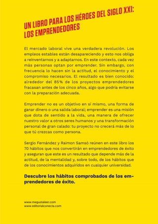 El documento presenta un índice con 57 capítulos agrupados en 7 partes sobre consejos para emprender un negocio. Los capítulos tratan temas como definir la misión y valores del proyecto, prepararse física y mentalmente, pensar en grande, rodearse de un buen equipo, y hacer despegar el proyecto.