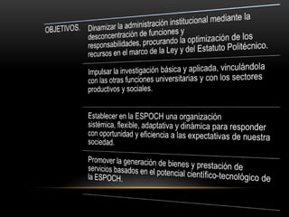 La Escuela Superior Politécnica de Chimborazo tiene como visión ser una institución líder en educación superior y soporte científico-tecnológico para el desarrollo de la provincia de Chimborazo y el país. Su misión es formar profesionales competentes, emprendedores y conscientes de su identidad nacional para contribuir al desarrollo sostenible del país a través de la generación y aplicación del conocimiento. Sus objetivos incluyen lograr una administración eficiente, desarrollar una cultura organizacional integrad