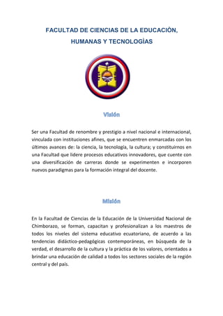 El documento describe los objetivos y propósitos de la Facultad de Ciencias de la Educación, Humanas y Tecnologías de la Universidad Nacional de Chimborazo. La facultad busca formar maestros de acuerdo a tendencias pedagógicas contemporáneas y liderar procesos educativos innovadores. Una de sus carreras es Educación Inicial, cuya meta es formar profesionales con competencias acordes a las necesidades sociales y en línea con los principios de interculturalidad, equidad y democracia del plan