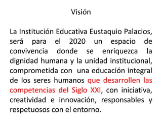 El documento presenta la misión, visión y propósitos de la Institución Educativa Eustaquio Palacios. Su misión es formar seres humanos en los niveles de educación inicial, básica y media, facilitando la apropiación del saber acorde a las necesidades ambientales, sociales y laborales del entorno. Su visión es ser para el 2020 un espacio de convivencia donde se enriquezca la dignidad humana y la unidad institucional, comprometida con una educación integral. Sus propósitos incluyen promover una educación activa
