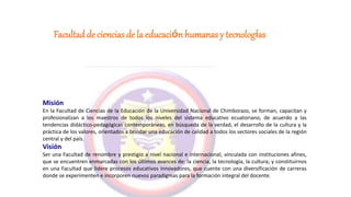 Este documento presenta las misiones y visiones de la Universidad Nacional de Chimborazo, su Facultad de Ciencias de la Educación y la Carrera de Psicología Educativa. La universidad busca formar profesionales emprendedores que contribuyan a resolver los problemas del país. La facultad forma maestros de acuerdo a tendencias didácticas contemporáneas. La carrera de psicología educativa busca formar psicólogos líderes a nivel nacional e internacional que promuevan el progreso y buen vivir de