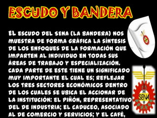 Este documento presenta información sobre el Servicio Nacional de Aprendizaje (SENA) de Colombia. Explica el significado de su escudo y bandera, que representan los tres sectores económicos en los que opera la institución. También describe el significado de su logo y el camino de aprendizaje y superación que representa. Finalmente, resume su misión de ofrecer formación profesional gratuita para contribuir al desarrollo del país, y su visión de ser una organización de conocimiento innovadora acorde a las necesidades del sector empresarial y los