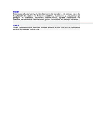 La misión de la institución es crear, desarrollar y difundir conocimiento y cultura a través de la formación académica, investigación y vinculación con la comunidad, bajo principios de pertinencia, equidad e interculturalidad para fortalecer el talento humano y construir una mejor sociedad. Su visión es ser una referente a nivel regional reconocida a nivel nacional e internacional.