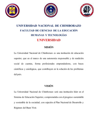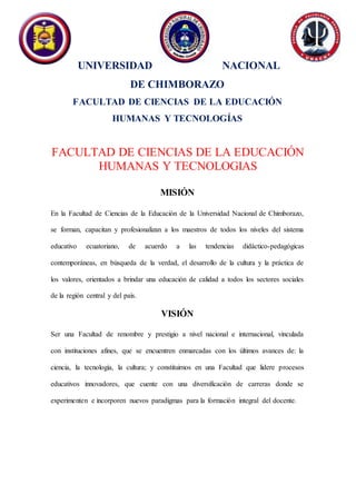 La Universidad Nacional de Chimborazo tiene como misión formar profesionales con bases científicas y axiológicas que contribuyan a resolver los problemas del país. Su visión es convertirse en una institución líder comprometida con el progreso sostenible de acuerdo con el Plan Nacional de Desarrollo. La Facultad de Ciencias de la Educación forma maestros de acuerdo a tendencias pedagógicas contemporáneas buscando verdad, cultura y valores. Su visión es ser reconocida a nivel nacional e internacional por