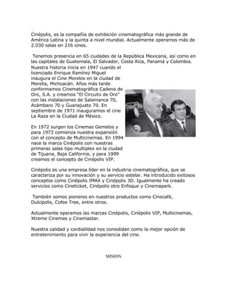 Cinépolis es la compañía de cines más grande de América Latina y la quinta a nivel mundial, con más de 2,030 salas en 216 cines en México, Guatemala, El Salvador, Costa Rica, Panamá y Colombia. Fundada en 1947 en Morelia, Michoacán, Cinépolis se ha convertido en un líder de la industria cinematográfica mediante la innovación de conceptos como Cinépolis IMAX, Cinépolis 3D y servicios como Cineticket.