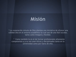 La Universidad Minuto de Dios (Uniminuto) busca ofrecer una educación de alta calidad, accesible y flexible para formar profesionales éticos y competentes. Su visión es crear profesionales que puedan desempeñarse en diferentes áreas socio-pedagógicas para ayudar al país. La universidad se enfoca en procesos académicos prácticos y teóricos para formar personas íntegras, cultas y honestas con alto nivel de competitividad.