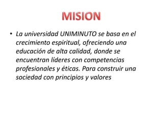 La universidad UNIMINUTO se basa en ofrecer una educación de alta calidad enfocada en el crecimiento espiritual y la formación de líderes con valores éticos para construir una sociedad mejor. Su visión incluye inculcar la vida espiritual, brindar educación de calidad a los estudiantes para contribuir al desarrollo del país, y expandirse a más sedes para aumentar su impacto e influencia a través de amplias relaciones nacionales e internacionales.