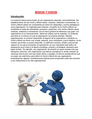 El documento explica la diferencia entre la misión y la visión de una empresa. La misión se refiere a la razón actual de ser de la empresa y describe sus actividades y clientes actuales. La visión se refiere a cómo la empresa espera verse en el futuro a largo plazo y describe metas ambiciosas e inspiradoras. Ambos conceptos son importantes para guiar el desarrollo estratégico de la empresa.