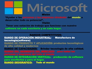 El documento describe la visión y misión de varias empresas en Perú, cada una enfocándose en distintos sectores como telecomunicaciones, tecnología, comercio y transporte. Estas empresas buscan liderar en sus respectivos mercados mediante la calidad del servicio, innovación y el bienestar de sus clientes y empleados. Además, se especifican los rangos competitivos, incluyendo operación industrial, productos y mercado objetivo para cada sector.