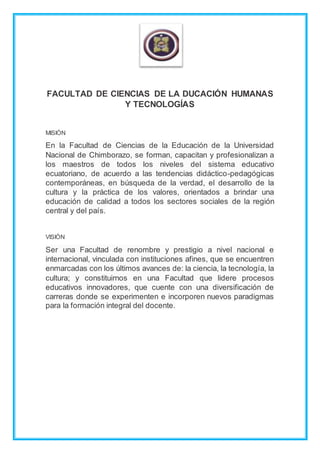 La Universidad Nacional de Chimborazo busca formar profesionales investigadores y emprendedores que contribuyan a resolver los problemas de la comunidad y el país. Su visión es convertirse en una institución líder comprometida con el progreso sostenible de acuerdo con el plan nacional de desarrollo. La Facultad de Ciencias de la Educación y Tecnologías forma maestros de acuerdo con tendencias didácticas contemporáneas para brindar una educación de calidad. Su visión es ser reconocida internacionalmente por procesos