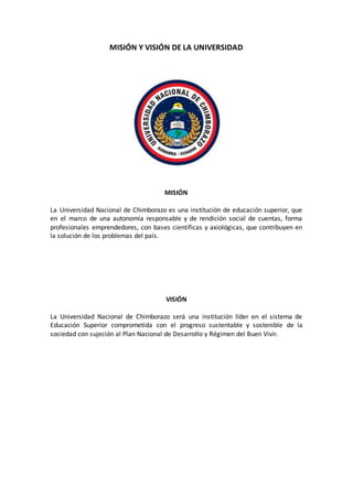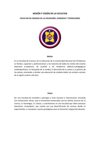 El documento presenta la misión y visión de la Universidad Nacional de Chimborazo, su Facultad de Ciencias de la Educación, Humanas y Tecnologías, y la carrera de Psicología Educativa. La misión de la universidad es formar profesionales emprendedores que contribuyan a solucionar los problemas del país. Su visión es ser una institución líder comprometida con el progreso sostenible de acuerdo con el Plan Nacional de Desarrollo. La facultad busca formar maestros de acuerdo a tendencias